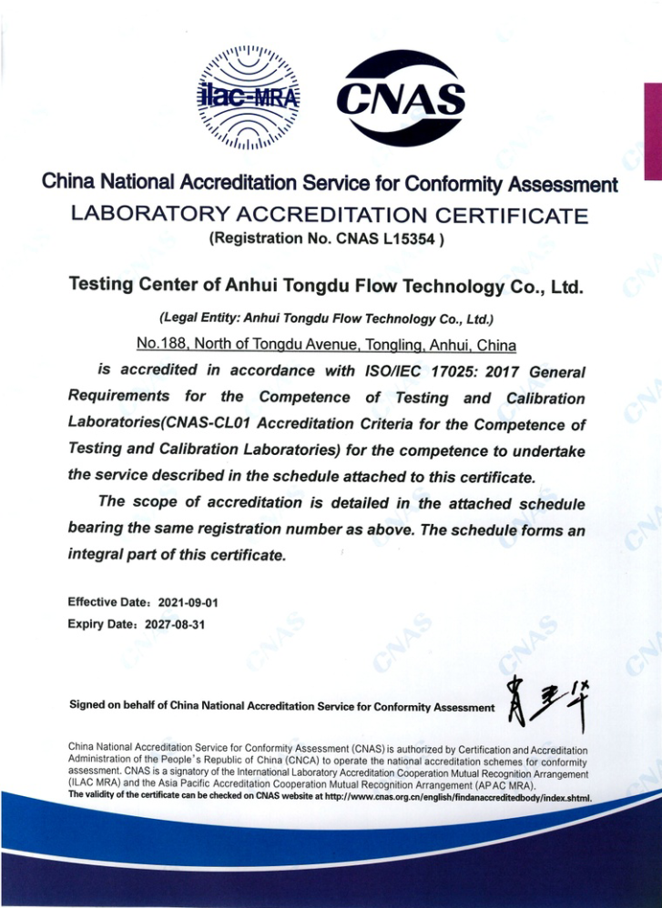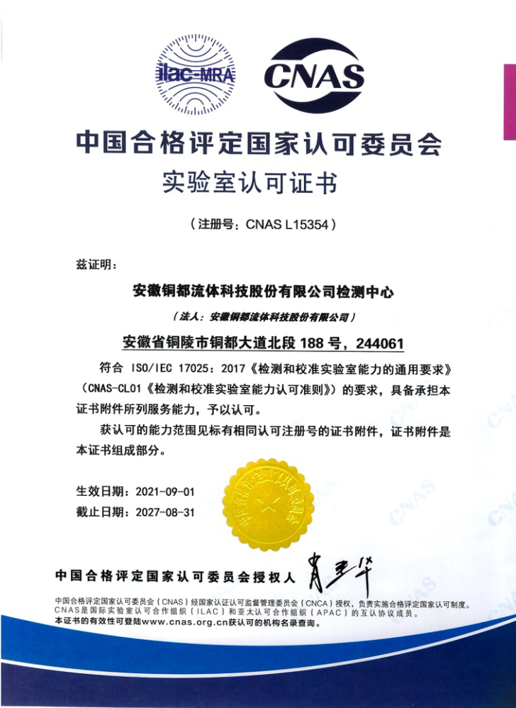 安徽銅都流體科技股份有限公司于近日獲得“中國合格評定國家認可委員會(CNAS)實驗室認可證書”。